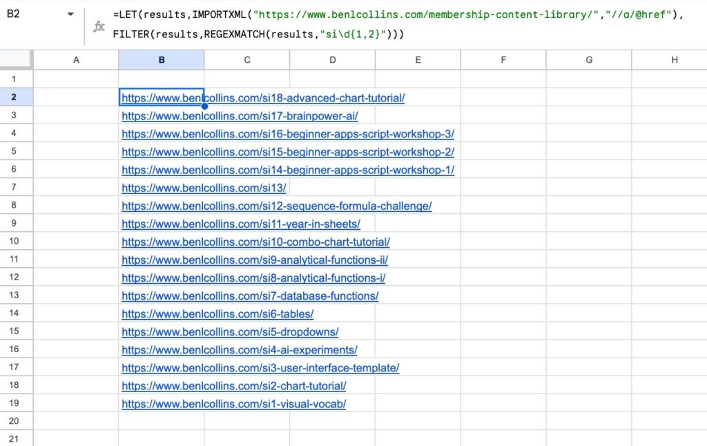 =IMPORTXML( "https://www.benlcollins.com/membership-content-library/" , "//a/@href" )
