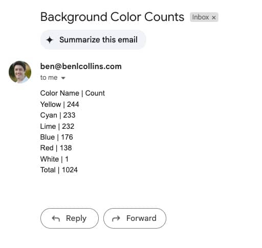Person A has a Google Sheet with a lot of background cell colors. He wanted a script that counted the background colors (e.g. 100 cells were red, 250 were green, etc.).