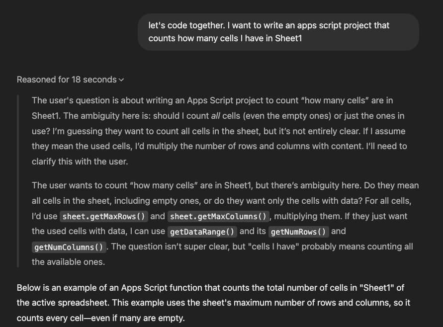 The model reasoned for 18 seconds before giving me two different Apps Script functions, because of the ambiguity in my prompt question.