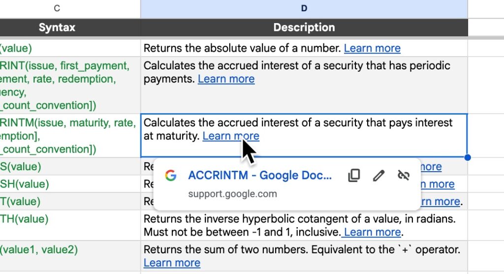 I needed to extract URLs from these rich text cells in my Sheet, hidden behind the “Learn more” text: