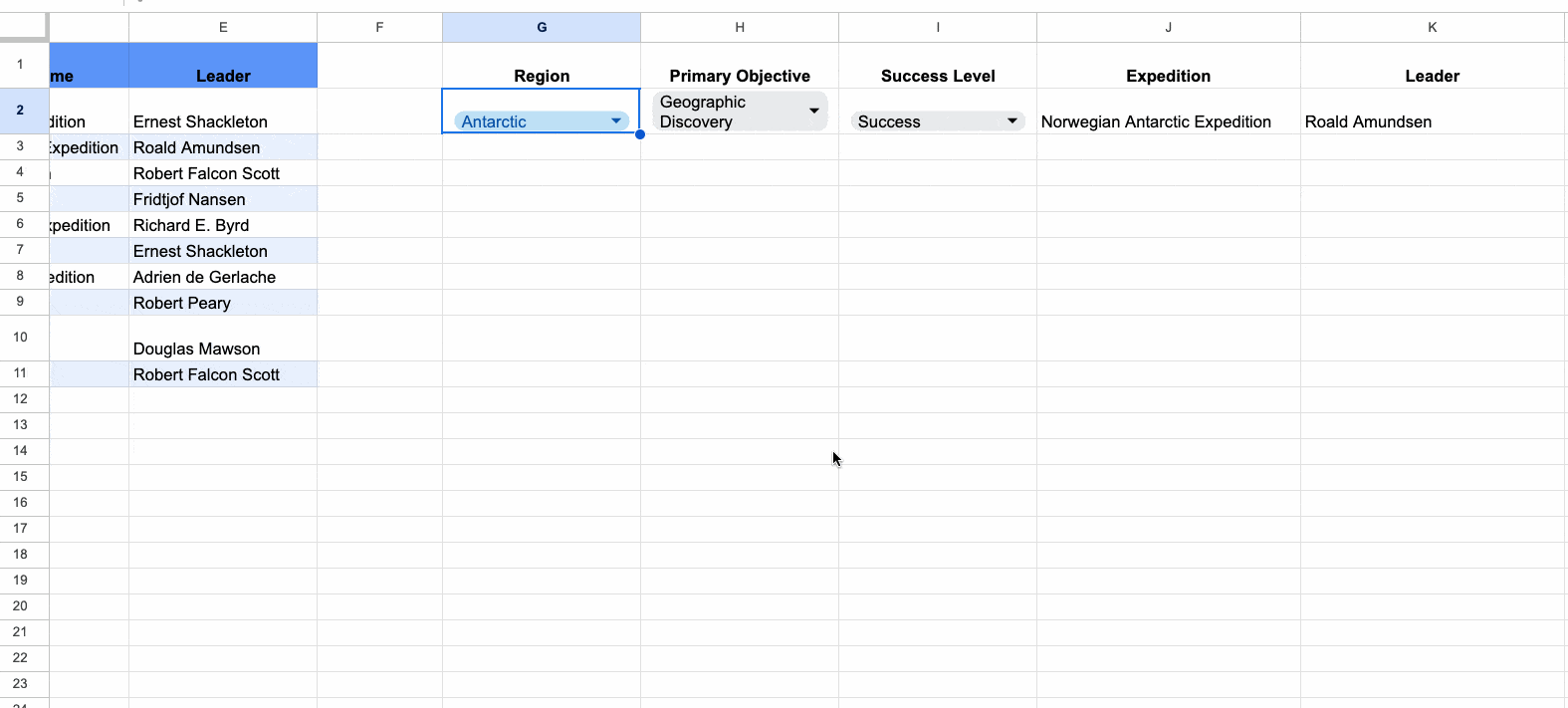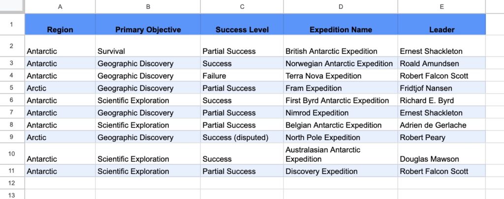 Let’s consider this dataset in A1:E11, of expeditions from the golden age of polar exploration: