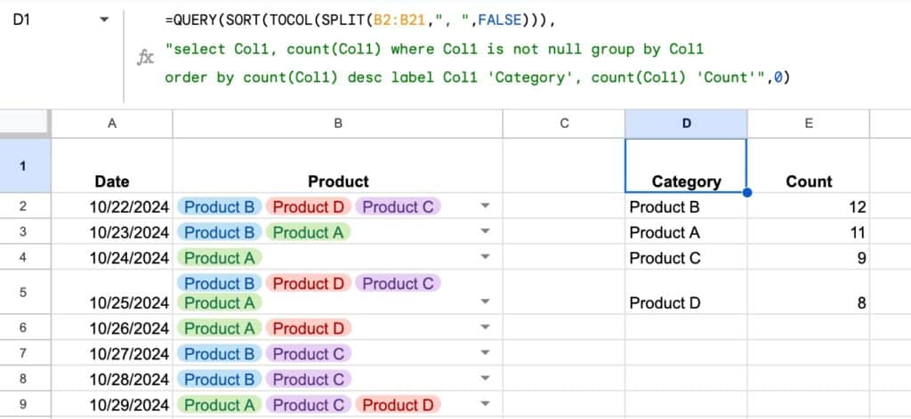 =QUERY(SORT(TOCOL(SPLIT(B2:B21,", ",FALSE))), "select Col1, count(Col1) where Col1 is not null group by Col1 order by count(Col1) desc label Col1 'Category', count(Col1) 'Count'",0)